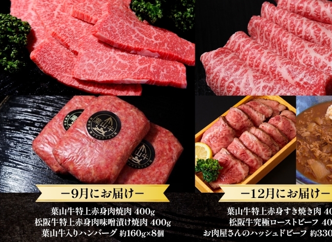 【9月】葉山牛特上赤身肉焼肉400g、【自家製加工】松阪牛特上赤身肉味噌漬け焼肉400g、葉山牛入りハンバーグ約160g×8個