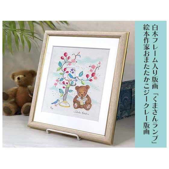 7. 白木フレーム入り版画「くまさんランプ」絵本作家おまたたかこジークレー版画