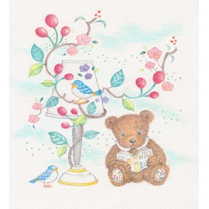逗子に住んで20年になる絵本作家 おまたたかこ の色鉛筆で描かれたぬいぐるみのクマさんとランプです。描いていくうちにランプの模様はいつしかどんどん広がって一本の木のようになりました。作者は、デビュー作の「ハムスターまも日誌」から20年に渡って動物が主人公の絵本を描き続けてきました。最新作は逗子の街が舞台になった「くまのヨーキィさんとちいさなむら」です。