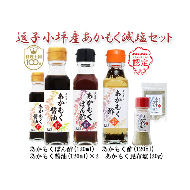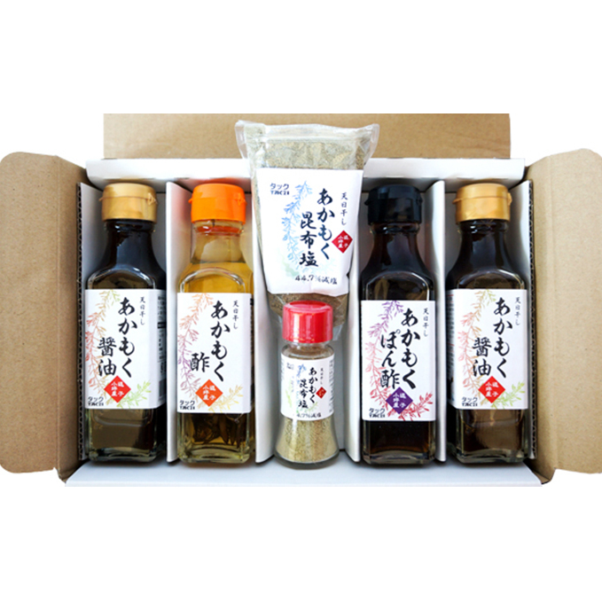 減塩生活を応援する逗子小坪産「あかもく」調味料4種。塩分が気になる調味料ですが、「あかもく醤油」は約38.0%減塩。本醸造木樽醤油をベースにあかもくの旨みととろみがたっぷりで、食材に味がよくからむので、少量でも美味しくいただけます。やさしく爽やかな味の「あかもくぽん酢」は約43.1%減塩。「あかもく昆布塩」は約44.7%減塩。海流の流れが速く、きれいな海で知られる男鹿半島のミネラル海水塩を使用しました。さらにあかもくの旨みが効いた「あかもく酢」も減塩に欠かせません。いずれもあかもくの旨みによって、塩分控えめでもお料理に深い味わいが生まれ、美味しさ倍増です。化学調味料、合成添加物不使用です。