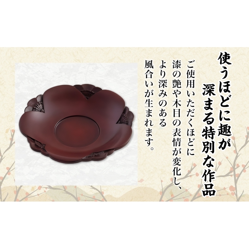 梅の生命力あふれる姿が器全体に表現され、一つ一つ手作業で仕上げた漆塗りは、ほんのりと光沢を放ち、