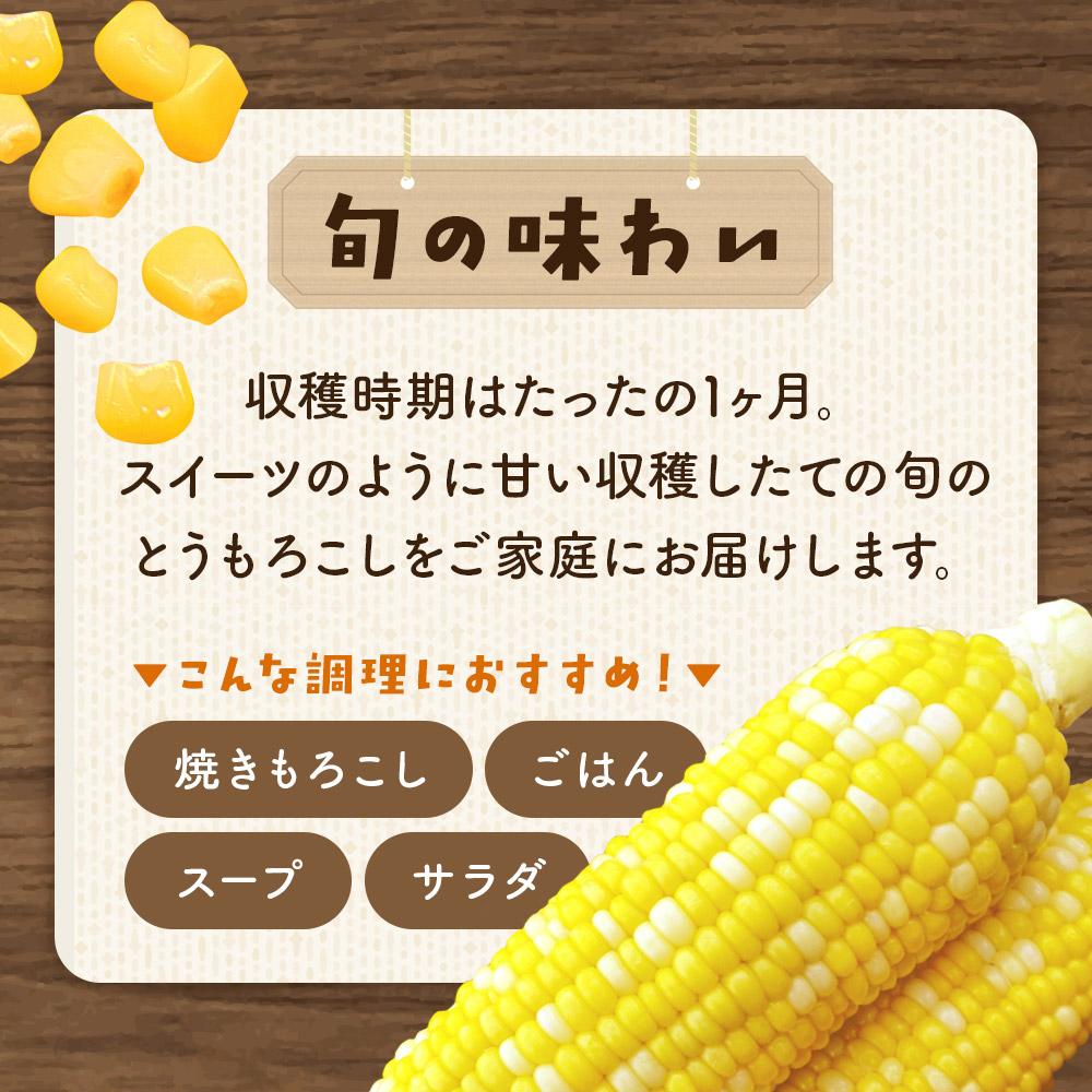そのままでも十分甘く美味しいほか、焼きもろこし、とうもろこしご飯、かき揚げ、コーンスープ、サラダ、ラーメンのトッピングなど、多彩な料理に活躍します。