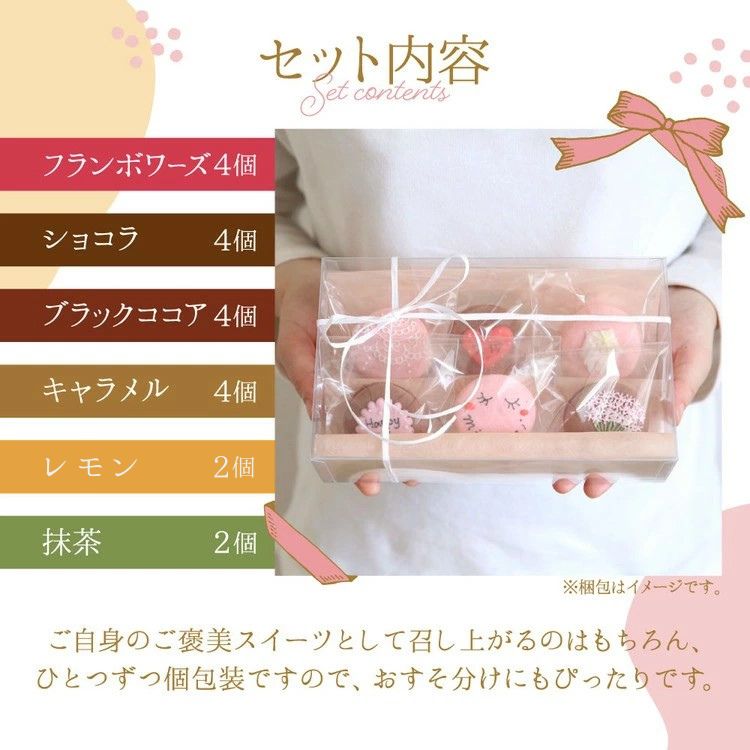 【味】フランボワーズ4個、ショコラ4個、ブラックココア4個、キャラメル4個、レモン2個、抹茶2個