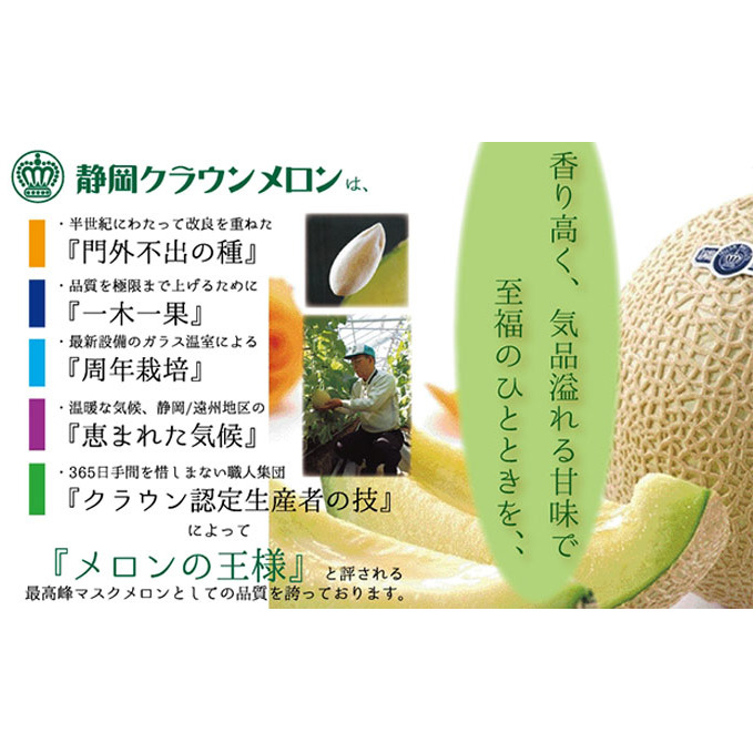静岡県袋井市が誇る果実の王様マスクメロンの最高級ブランド「クラウンメロン」は、約100日をかけて、1本の木で1玉だけのメロンを愛情込めて育てています。熟練生産者の高い技術と袋井市の温暖な気候により、1年を通してご提供いたします。