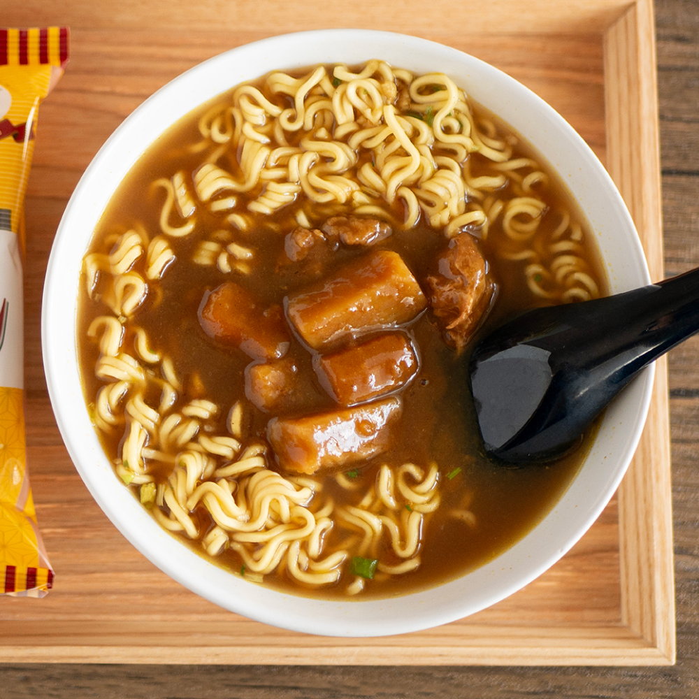 明治41年発刊「海軍割烹術参考書」の「カレイライス」のレシピを基に食べやすく復元した大人気ご当地レトルト「よこすか海軍カレー」の味を、スープで再現したインスタントラーメンです。