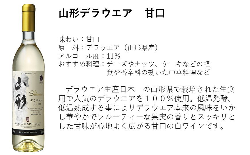 (有)朝日町ワインは朝日町ぶどう生産組合25軒の契約栽培農家が丹精込めて栽培した原料を主体に山形県産100%で醸造しております。特に「マスカットベーリーA種」は、朝日町ワインを代表する品種で契約栽培の原料のみを使用し醸造した「山形マスカットベーリーA ロゼ 甘口」と、セットでお届けする山形県産デラウエアを100%使用した「山形デラウエア甘口」と併せてお楽しみください。