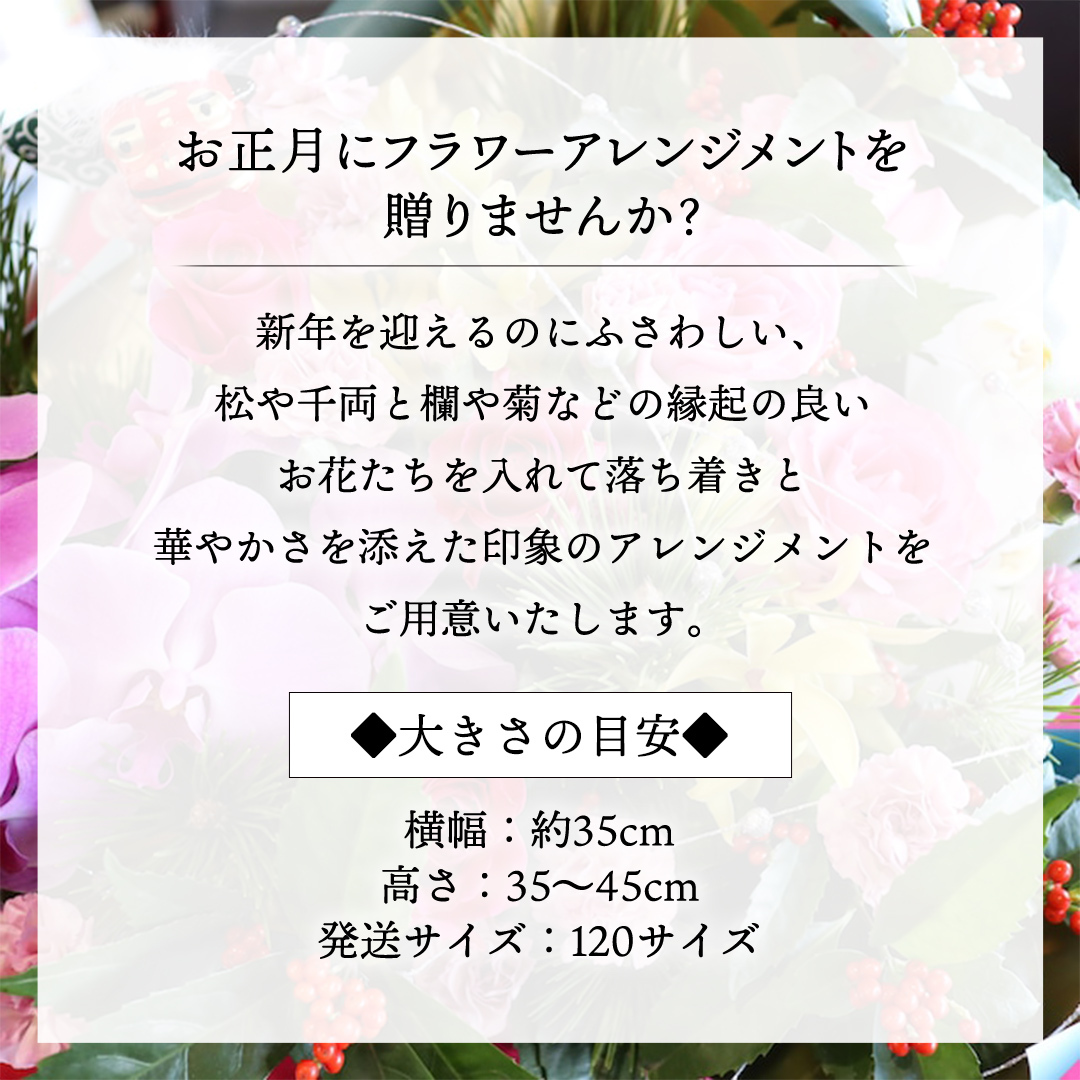 12月下旬に発送いたします。新年を迎えるのにふさわしい、松や千両と欄や菊などの縁起の良いお花たちを入れて落ち着きと華やかさを添えた印象のアレンジメントをご用意いたします。