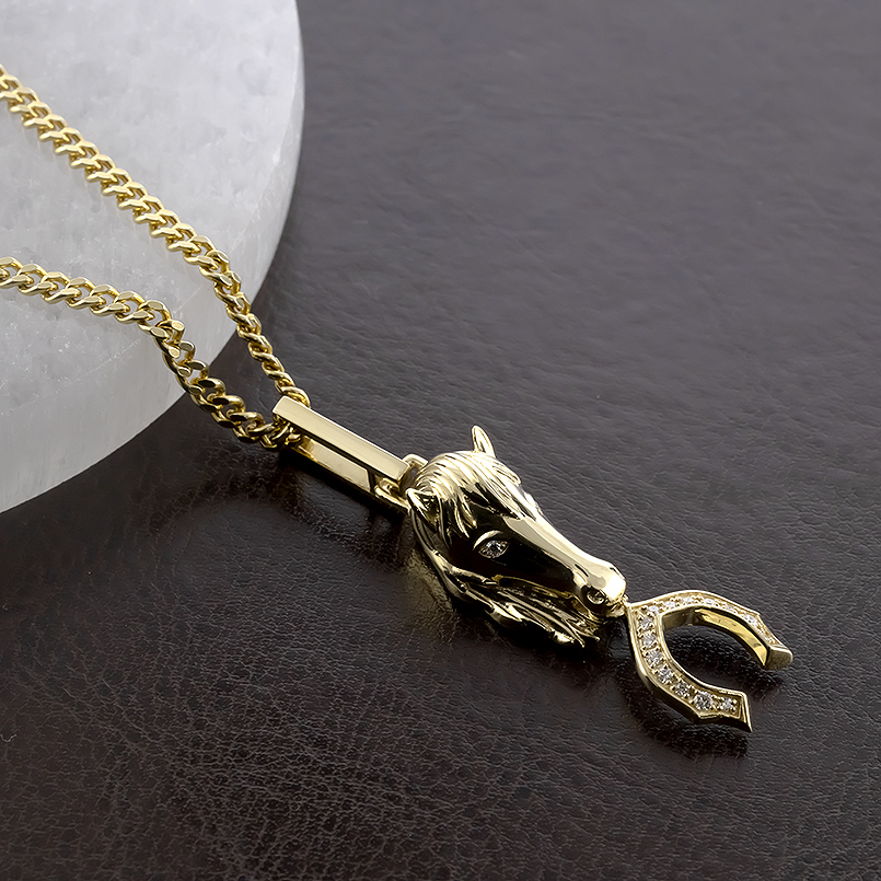 優雅で美しく知性的な表情の馬にダイヤモンドを留めた馬蹄がゴージャスなペンダントトップ