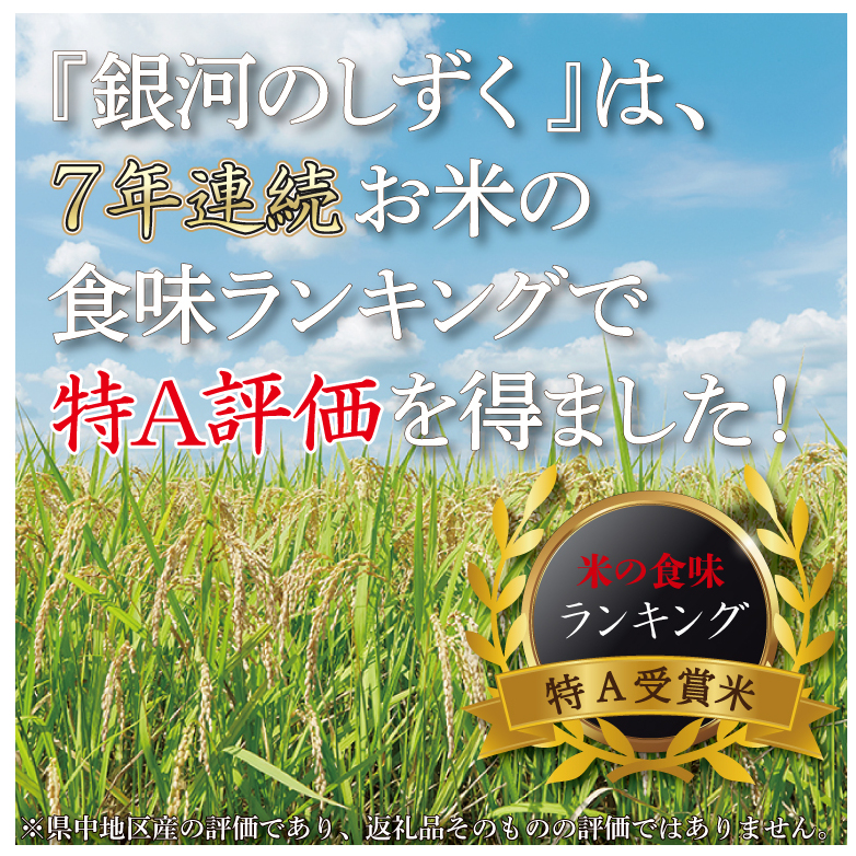 「銀河のしずく」は、米の食味ランキングで最高評価である特Aを7年連続で得ております。