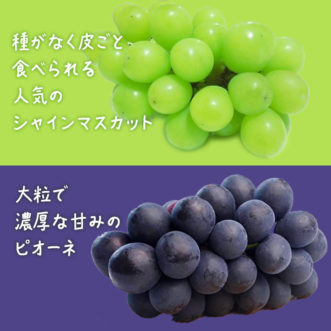 大粒で濃厚な甘みの「ピオーネ」と、種がなく皮ごと食べられる人気の「シャインマスカット」の上品な甘みが一度に楽しめる、まさに夢のような組み合わせです。