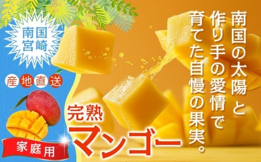 ギフトとしても人気の「宮崎完熟マンゴー」ですが、こちらは産地だからこそ出来る『ご家庭用』としてご用意しました。サイズが不揃いのものや、色付きが悪いもの、傷や黒い斑点があるなど外観が良くない規格外のもので、見た目は多少劣りますが、味はA等級品と変わりません。芳醇な香り・濃厚な味わいは期待通りの「宮崎完熟マンゴー」です。