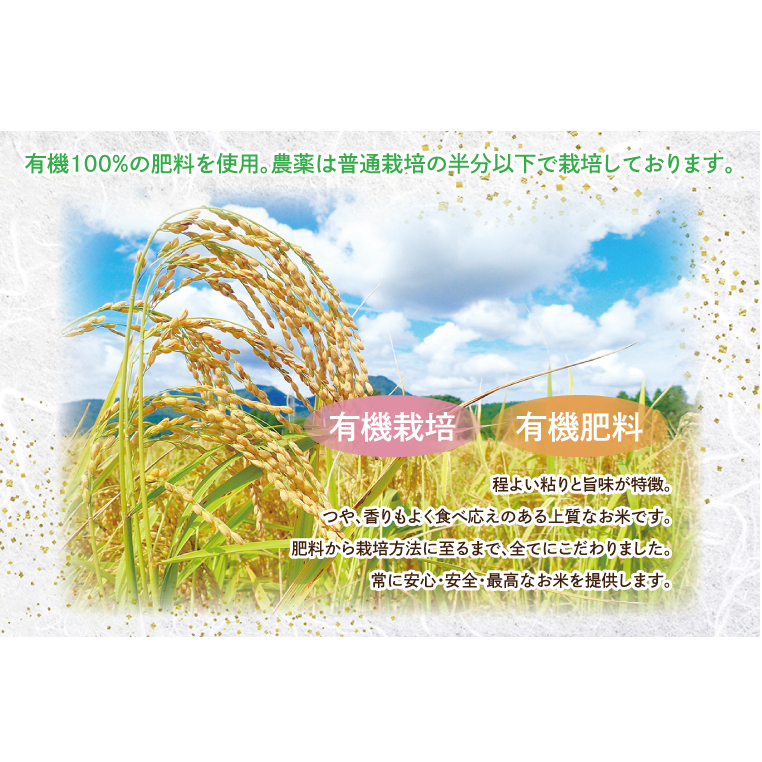 有機100%の肥料を使用。農薬は普通栽培の半分以下で栽培しております。