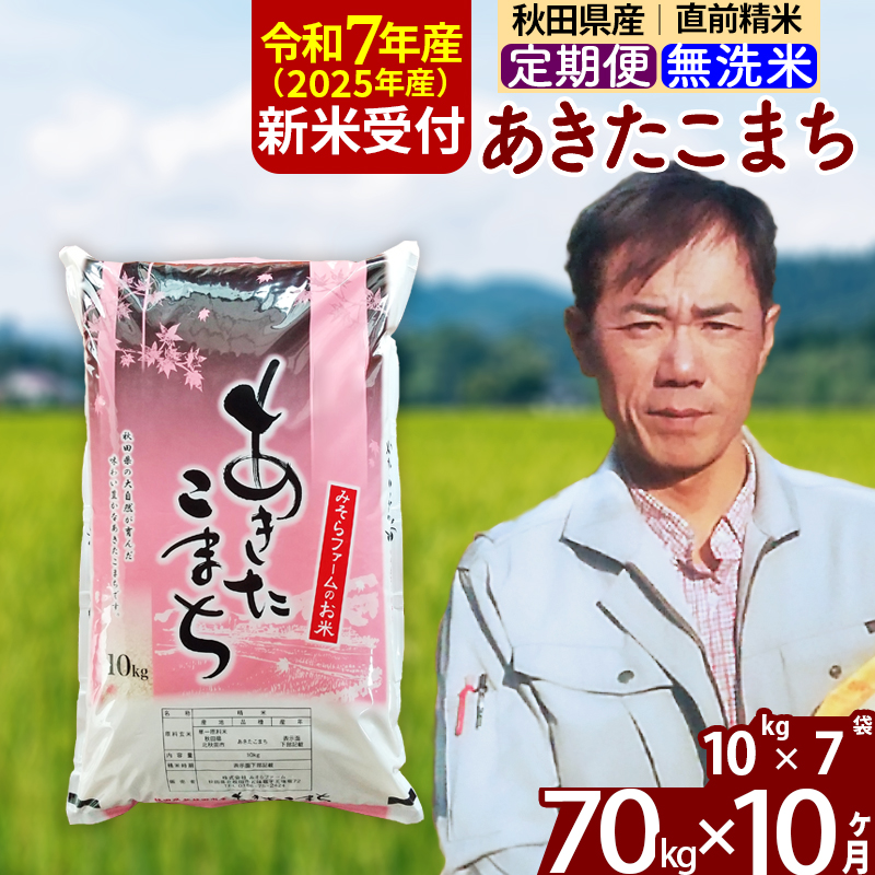 ※令和7年産 新米予約※《定期便10ヶ月》秋田県産 あきたこまち 70kg【無洗米】(10kg袋) 2025年産 お届け時期選べる お届け周期調整可能 隔月に調整OK お米 みそらファーム