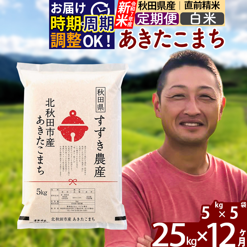 ※令和7年産 新米※《定期便12ヶ月》秋田県産 あきたこまち 25kg【白米】(5kg小分け袋) 2025年産 お届け時期選べる お届け周期調整可能 隔月に調整OK お米 すずき農産