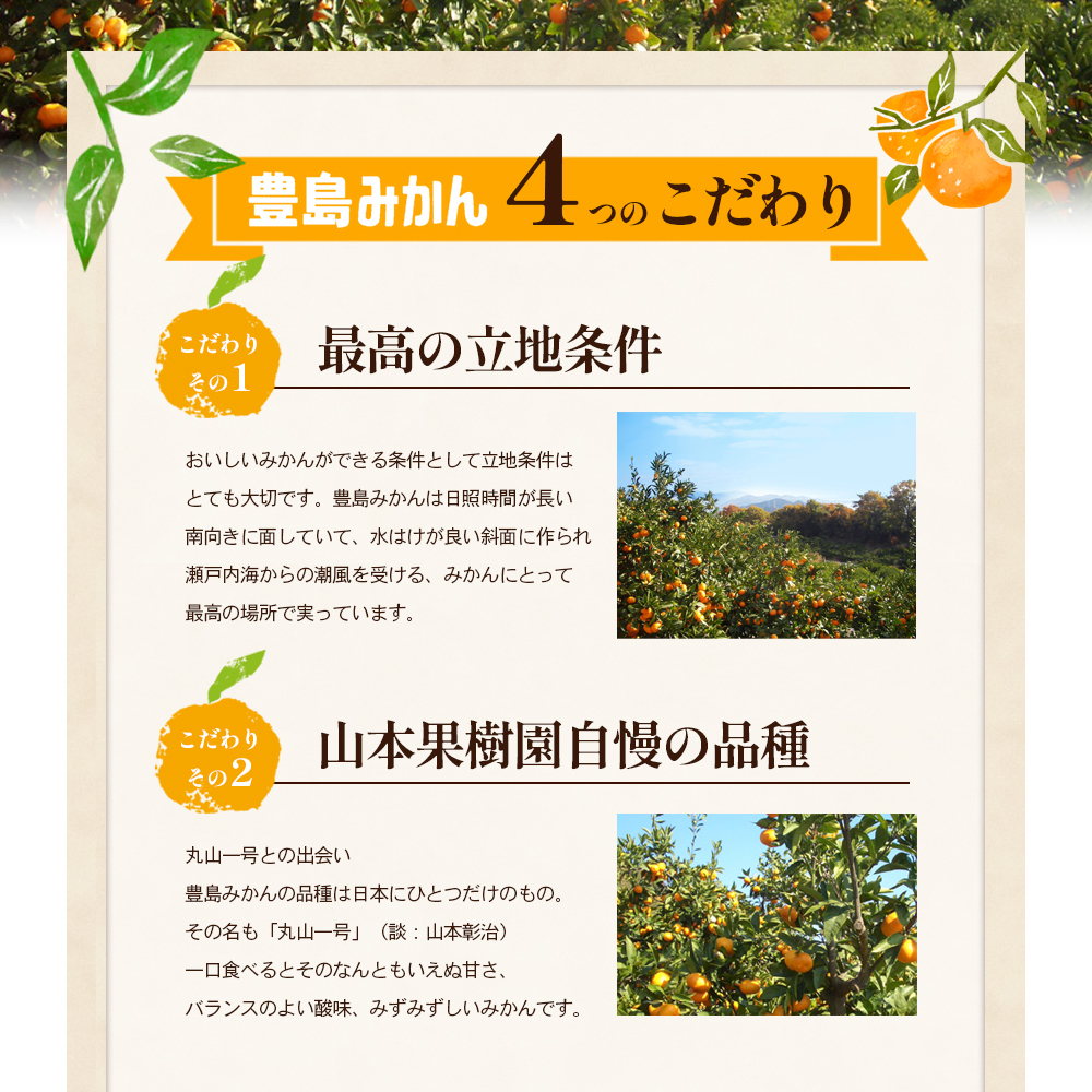 豊島みかんは、温暖な瀬戸内海の汐風を受け、日当たりのよい段々畠で育てられた太陽の申し子です。
