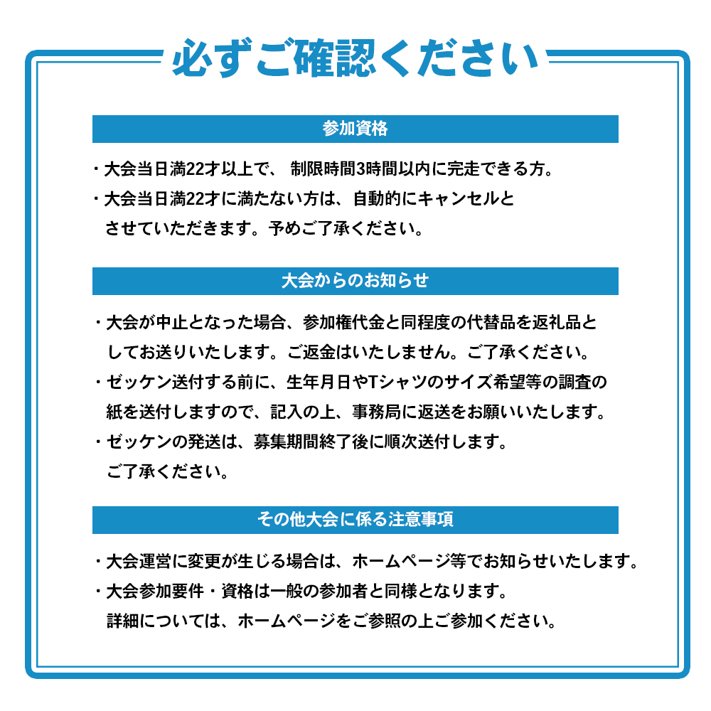 〇大会当日満22才以上で、 制限時間3時間以内に完走できる方。
