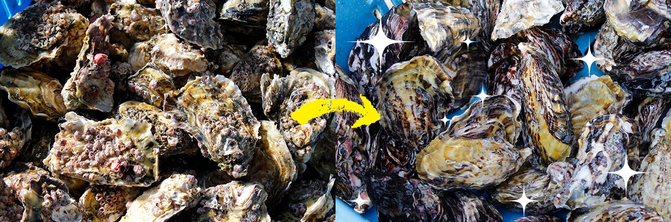 海の中で牡蠣を育てているとフジツボなどの付着物や汚れがついてしまうため、定期的に引き揚げて牡蠣や養殖カゴを洗浄しています。とても大変な作業ですが、美味しい牡蠣にするために丁寧に育てています。
