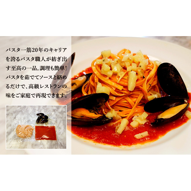 パスタ一筋20年のキャリアを誇るパスタ職人が紡ぎ出す至高の一品。プレミアム生パスタ&ムール貝の白ワイン煮とトマトソースのセット