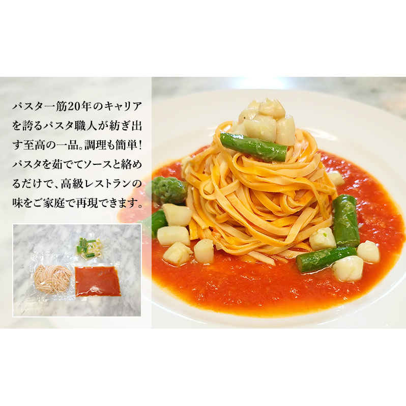 パスタ一筋20年のキャリアを誇るパスタ職人が紡ぎ出す至高の一品。プレミアム生パスタ&小貝とアスパラガスのトマトソースセット