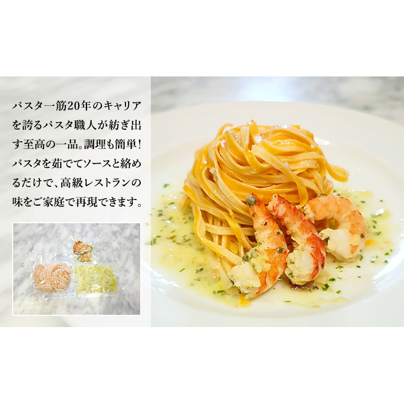 パスタ一筋20年のキャリアを誇るパスタ職人が紡ぎ出す至高の一品。プレミアム生パスタ&エビのレモンバターソテーとガーリックソースのセット