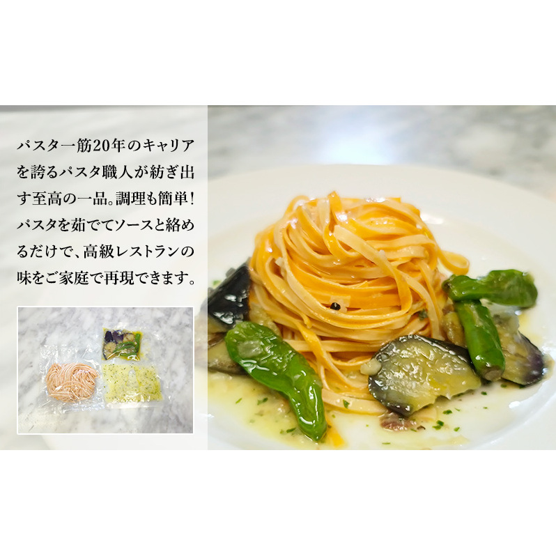 パスタ一筋20年のキャリアを誇るパスタ職人が紡ぎ出す至高の一品。プレミアム生パスタ&茄子とししとうのガーリックソースセット