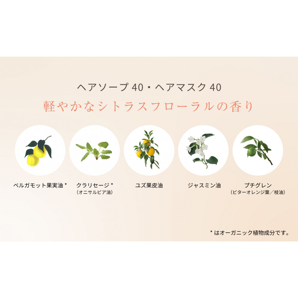 | 全成分 | ヘアソープ40 水、コカミドプロピルベタイン、オレフィン(C14-16)スルホン酸Na、ソルビトール、コカミドメチルMEA、ココイルメチルタウリンNa、ヤシ油脂肪酸PEG-7グリセリル、ココイルグルタミン酸TEA、ココアンホ酢酸Na、ベルガモット果実油、オニサルビア油、ユズ果皮油、ジャスミン油、ビターオレンジ葉/枝油、クコ果実エキス、チャ葉エキス、ムラサキバレンギクエキス、ワサビノキ種子エキス、ユズ果実エキス、フクロフノリエキス、ツバキ種子油、バオバブ種子油、ヒマワリ種子油、シロキクラゲ多糖体、マカデミアナッツ脂肪酸フィトステリル、グリチルリチン酸2K、ポリクオタニウム-51、ポリクオタニウム-10、ポリクオタニウム-22、フィトステロールズ、グリセリン、プロパンジオール、BG、ジステアリルジモニウムクロリド、ベヘントリモニウムクロリド、クエン酸、ヤシ脂肪酸TEA、ラウロイルアスパラギン酸Na、ココイルアラニンTEA、ココイルトレオニンNa、ココイルサルコシンNa、トリオレイン酸PEG-120メチルグルコース、塩化Na、PEG-20ソルビタンココエート、ヘキシレングリコール、カラメル、フェノキシエタノール、香料 *はオーガニック植物成分です。 ヘアマスク40 水、水添ナタネ油アルコール、ベヘニルPGトリモニウムクロリド、プロパンジオール、ヒマワリ種子油、セテアリルアルコール、ステアリン酸グリセリル、ベヘニルアルコール、ベルガモット果実油、オニサルビア油、ユズ果皮油、ジャスミン油、ビターオレンジ葉/枝油、クコ果実エキス、チャ葉エキス、ムラサキバレンギクエキス、ワサビノキ種子エキス、ユズ果実エキス、フクロフノリエキス、ツバキ種子油、バオバブ種子油、ゼイン、マカデミアナッツ脂肪酸フィトステリル、ポリクオタニウム-51、フィトステロールズ、ヒドロキシステアリン酸エチルヘキシル、(ヒマワリ種子油/水添ヒマワリ種子油)エステルズ、(ジグリセリン/ジリノール酸/ヒドロキシステアリン酸)コポリマー、BG、グリセリン、DPG、PPG-1/PEG-1ステアラミン、ビス(ダイズ油脂肪酸/ナタネ油脂肪酸)エチルヒドロキシエチルモニウムメトサルフェート、ジステアリルジモニウムクロリド、ベヘントリモニウムクロリド、カラメル、トコフェロール、ヘキシレングリコール、エタノール、フェノキシエタノール、香料 *はオーガニック植物成分です。 |