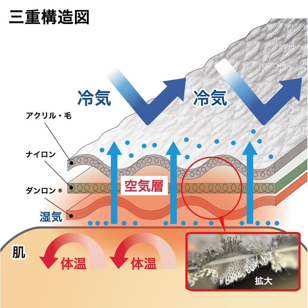 保温力を高めるため、特殊3重構造で丁寧に編みあげた生地を使用。