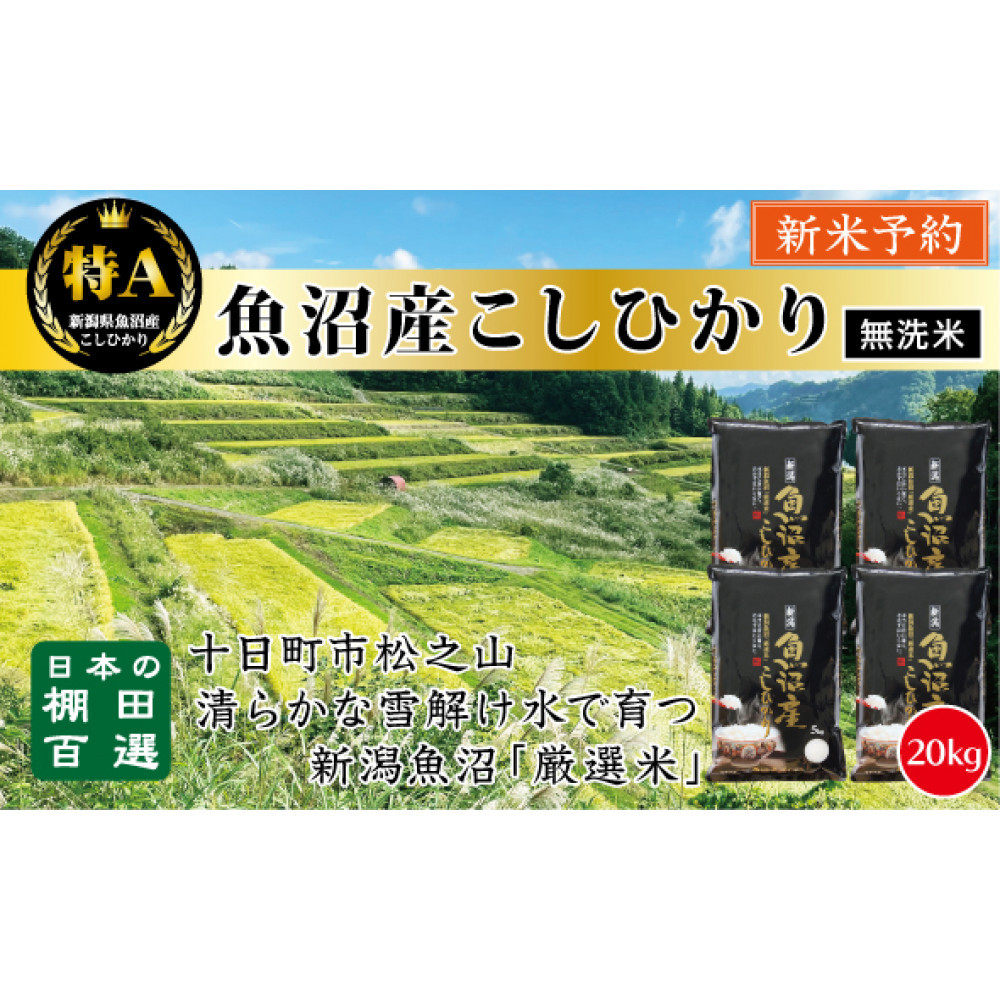 【無洗米】【令和7年産新米予約】【食味鑑定士厳選】 日本の棚田百選 新潟県十日町(魚沼)産 コシヒカリ20kg(5kg×4)