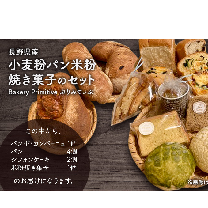 長野県産石臼引き小麦粉使用のパン・ド・カンパーニュ1個、長野県産小麦粉使用パン4個、長野県産米粉使用のシフォンケーキ2個、米粉焼き菓子1個