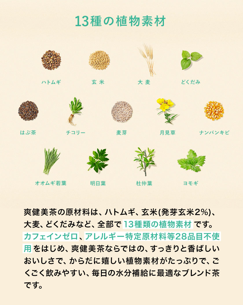 原材料名:ハトムギ、玄米(発芽玄米2%)、大麦、どくだみ、はぶ茶、チコリー、月見草、ナンバンキビ、オオムギ若葉、明日葉、杜仲葉、ヨモギ/ビタミンC