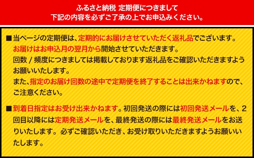 ■当定期便は、定期的にお届けをさせていただく返礼品でございます。お届けはお申込月の翌月から開始させていただきます。回数/頻度については掲載しております返礼品名をご確認いただきますようお願い申し上げます。また、指定のお届け回数の途中で定期便を終了することは出来かねますので、ご注意くださいませ。