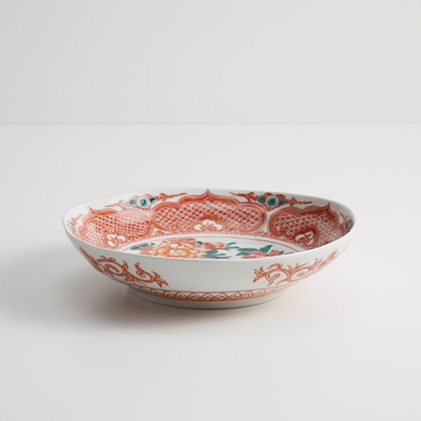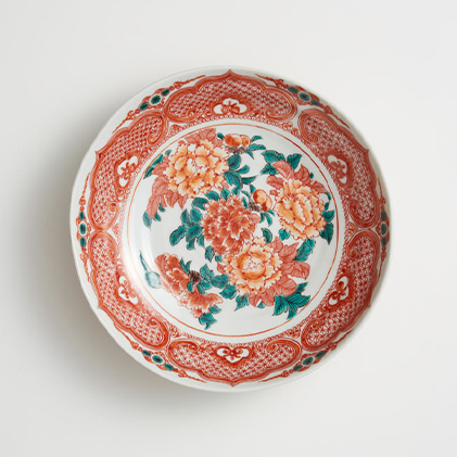 赤絵の細密部分と大胆にデザインされた牡丹の図、家族団欒のひと時、大切なお客様をお迎えした時に重宝しそうな器です。