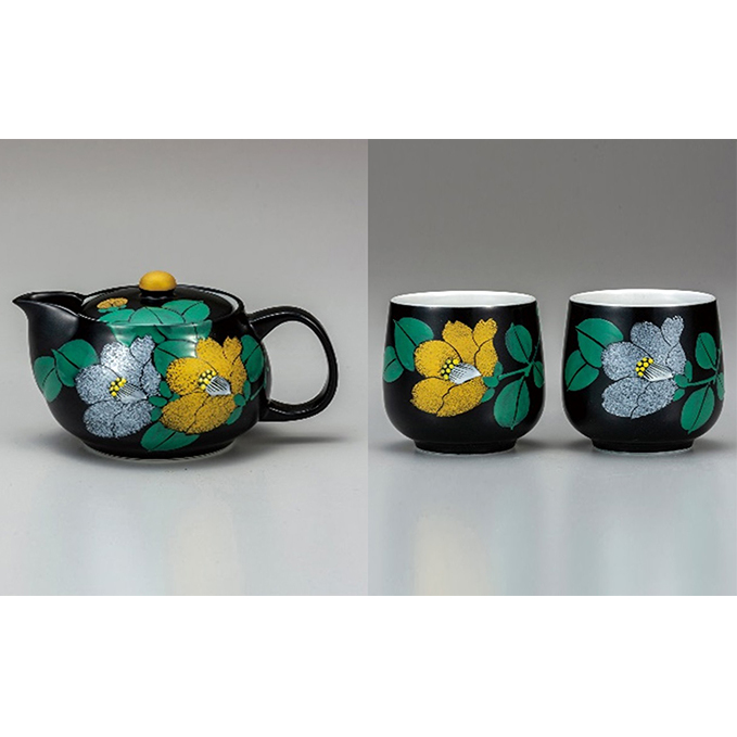 九谷焼 ポット急須・組湯呑 金銀彩椿(網付) a03 インテリア 工芸品 装飾品