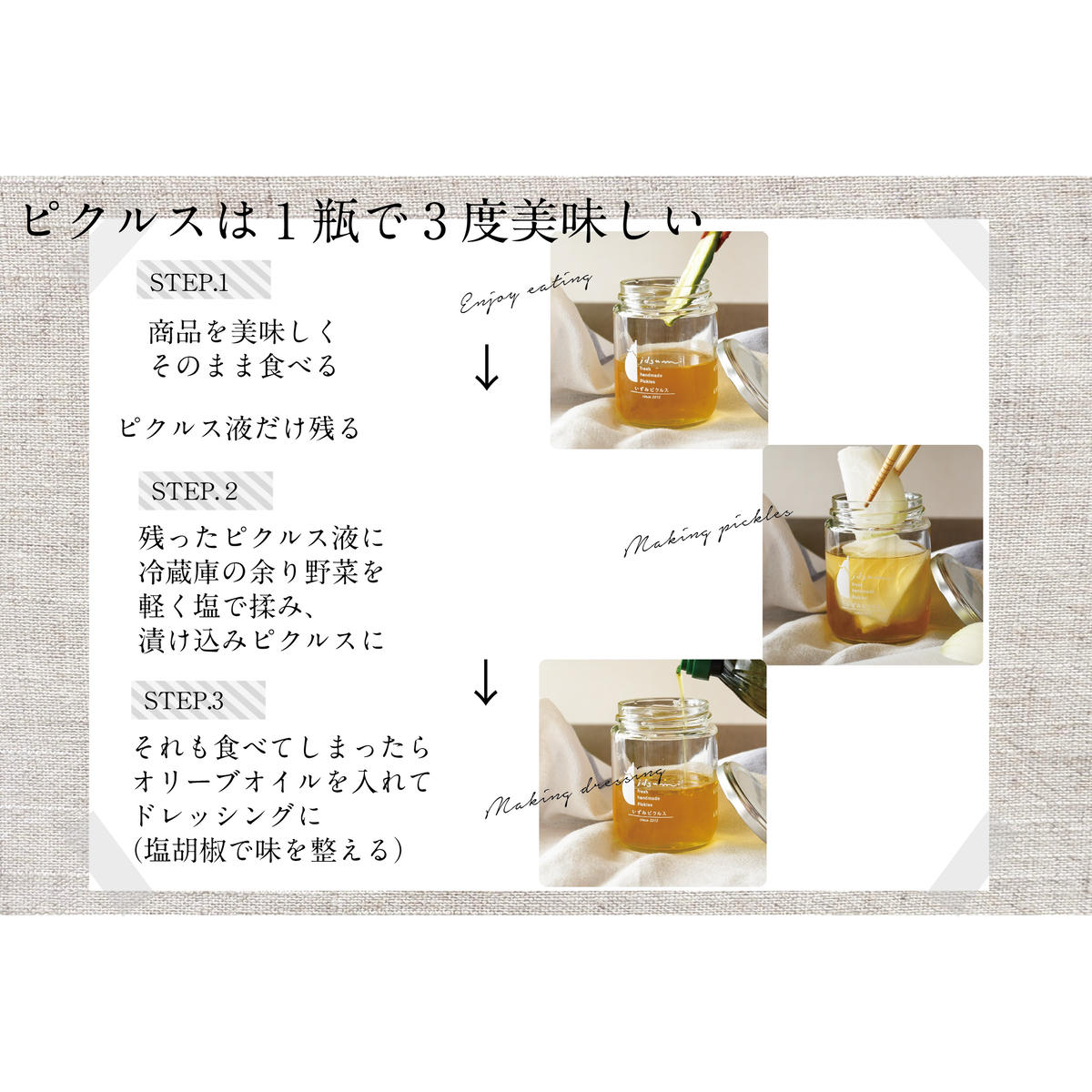 泉州特産の「水なすピクルス」と、いずみピクルスの人気ピクルスの中から計3個をセットにしました。