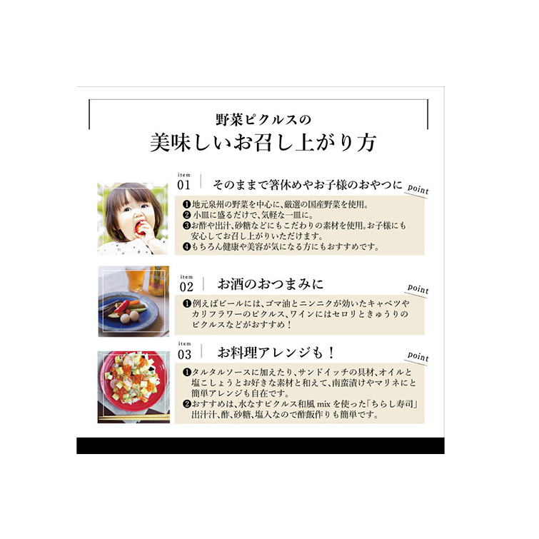 いずみピクルスでは、地元泉州や国産野菜を酸味まろやかなお酢、厳選した調味料、ハーブ、香辛料を使用し、お漬物感覚で召し上がっていただけるピクルスをお届けします。