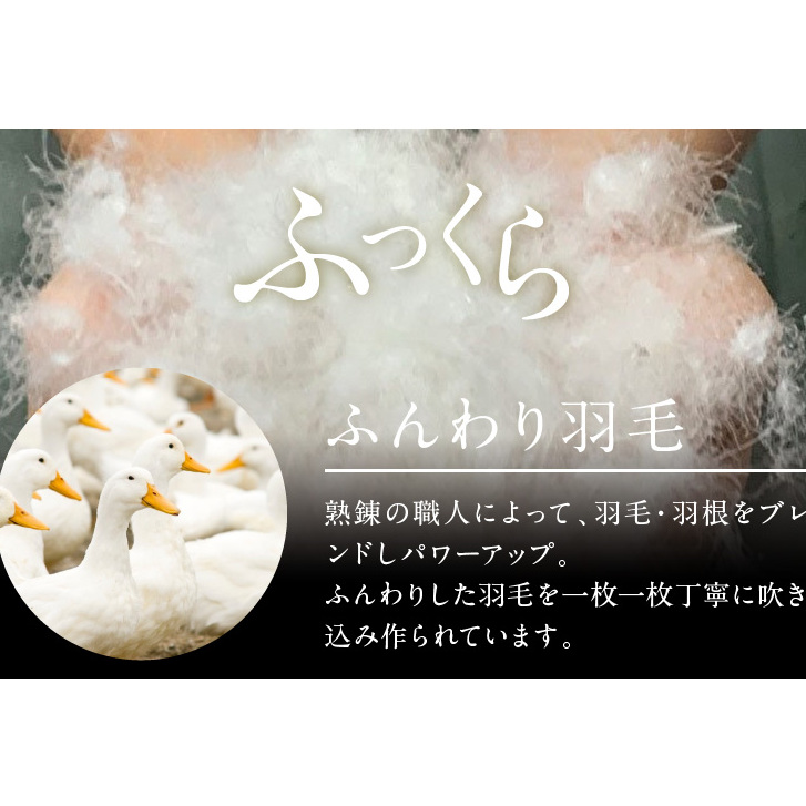 出来たてホヤホヤの羽毛ふとん。熟錬の職人によって、羽毛・羽根ブレンドしパワーアップ、ふんわりした羽毛を一枚一枚丁寧に吹き込み作られています。冬は暖かく、夏は湿気を吸収発散するので一年中快適に過ごす事ができます。