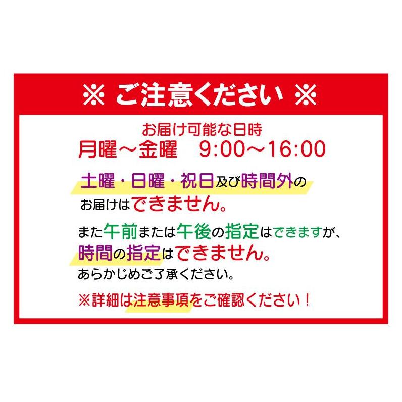 (1)お届け可能な日時は月曜~金曜の9:00~16:00です。土曜・日曜・祝日及び時間外のお届けはいたしかねます。また、午前または午後の指定は承れますが、時間の指定は承れませんのであらかじめご了承ください。