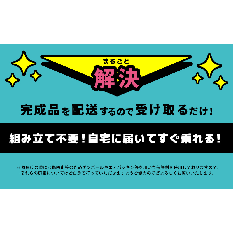 本自転車は泉佐野市内で最終加工・組み立てを行い、完成状態でお届けいたします。自転車を80%~90%を組み立てた状態でのお届けではありません。ご自身で組み立てる必要はございませんので、お届け後すぐにお使いいただけます。
