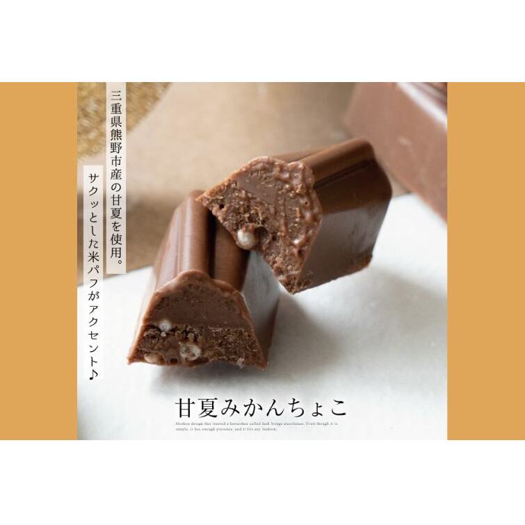 三重県熊野市産の甘夏みかんを贅沢に使用したこちらのチョコレートは、甘味と酸味の絶妙なバランスで子供から大人までお楽しみいただけます。熟練の職人が作るチョコレートをぜひご賞味ください。