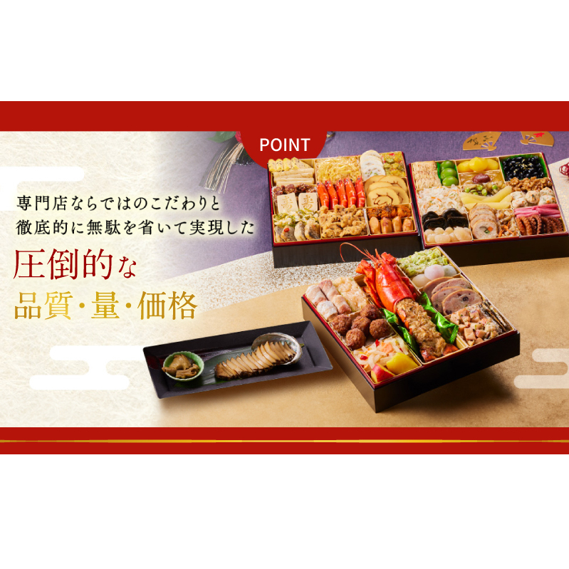 仕様:三段重 6.8寸、品目:28品目、人数:3人前