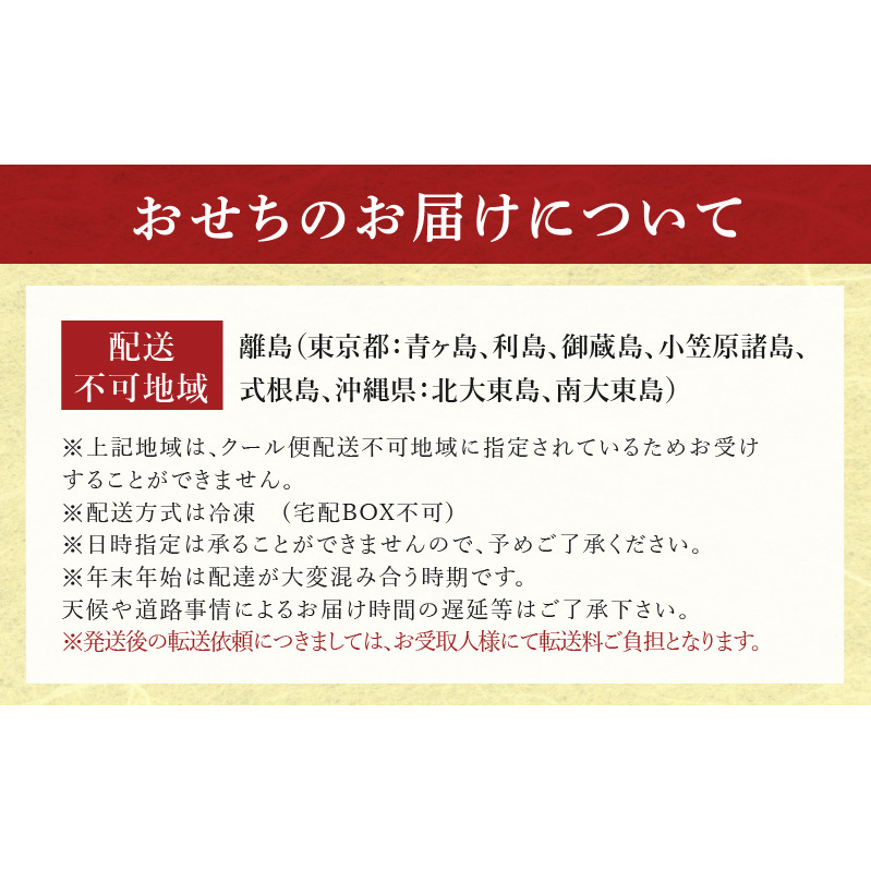 ・配送方式は冷凍(宅配BOX不可)、12月29日・30日・31日のいずれかの日程にお届けとなります。