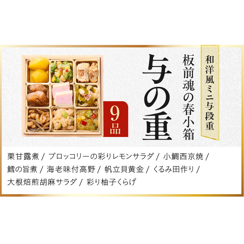 おせち「板前魂の春小箱」和洋風 ミニ与段重 36品 2人前 4.8寸 雑煮出汁&おこわ 付き【おせち料理 板前魂 贅沢おせち お節 惣菜 冷凍 先行予約 年内発送 おせち料理2026】 Y125
