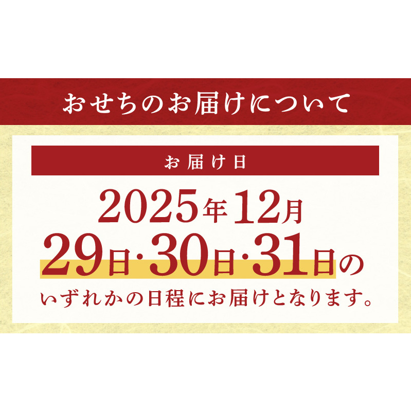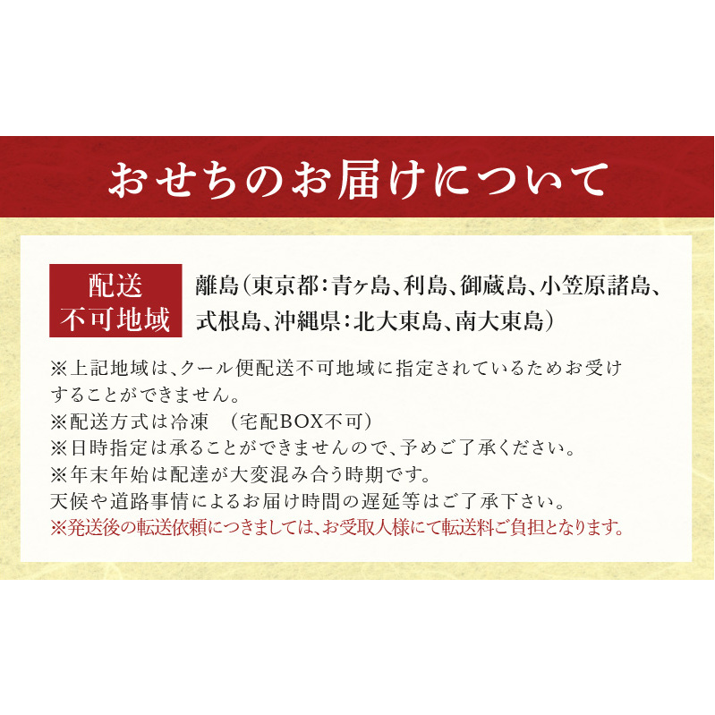 ・配送方式は冷凍(宅配BOX不可)、12月29日・30日・31日のいずれかの日程にお届けとなります。