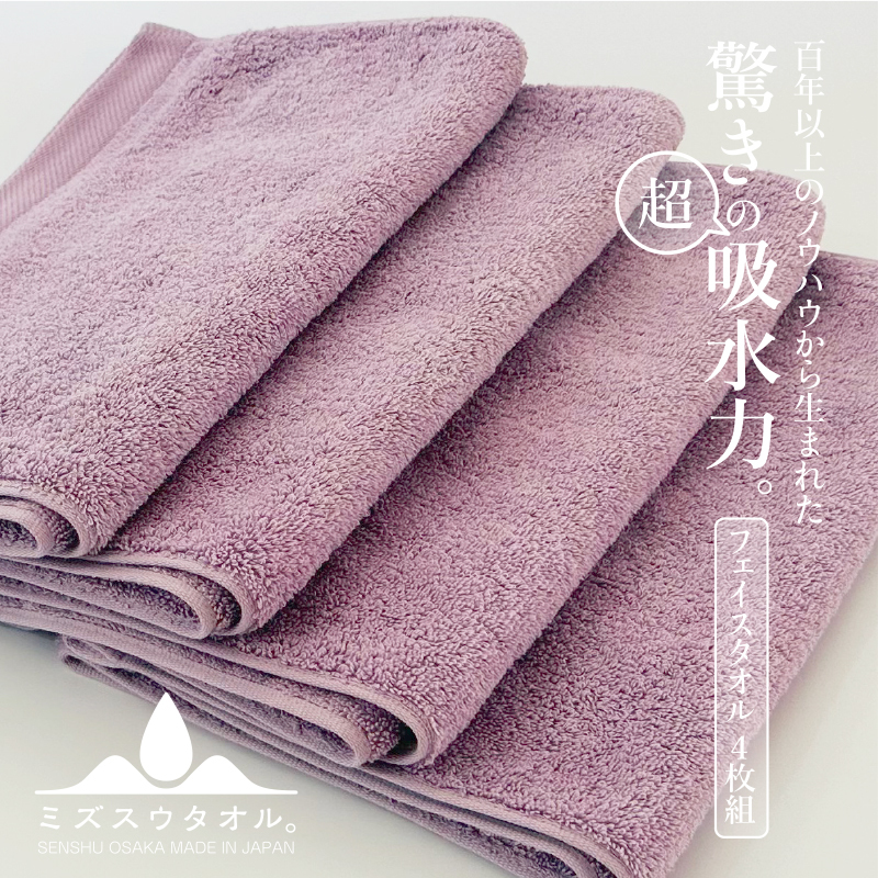 【驚きの吸水力】ミズスウタオル フェイスタオル 4枚 パープル【スピード発送 泉州タオル 国産 吸水 普段使い シンプル 日用品 家族 ファミリー】 020C326