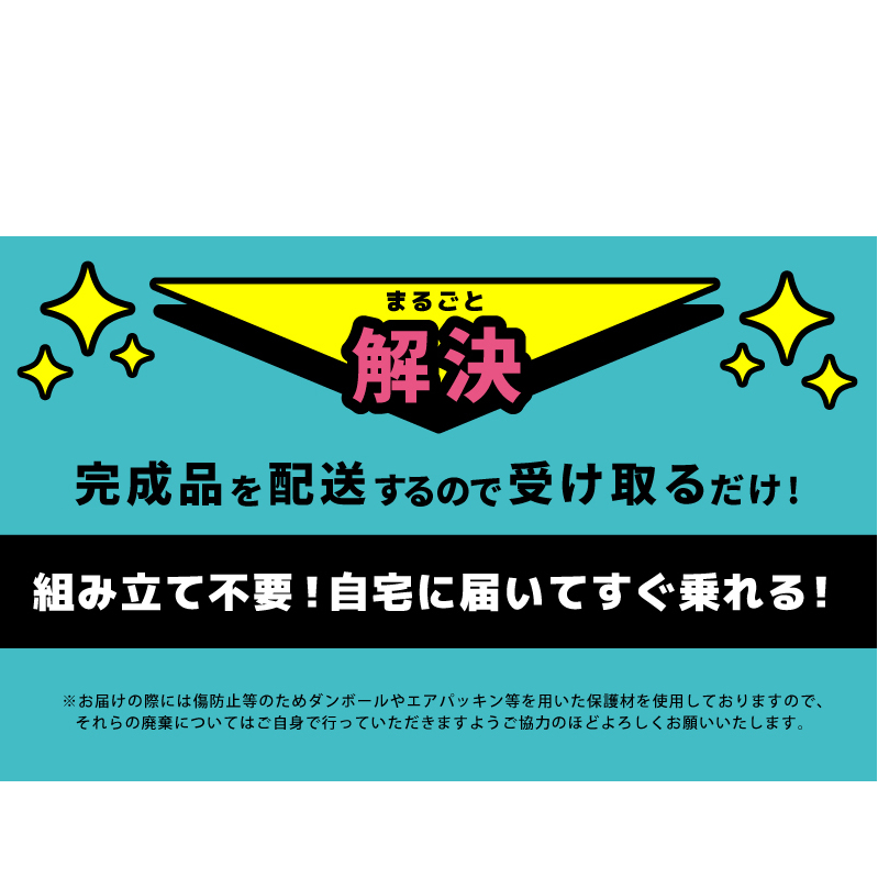 本自転車は泉佐野市内で最終加工・組み立てを行い、完成状態でお届けいたします。自転車を80%~90%を組み立てた状態でのお届けではありません。ご自身で組み立てる必要はございませんので、お届け後すぐにお使いいただけます。