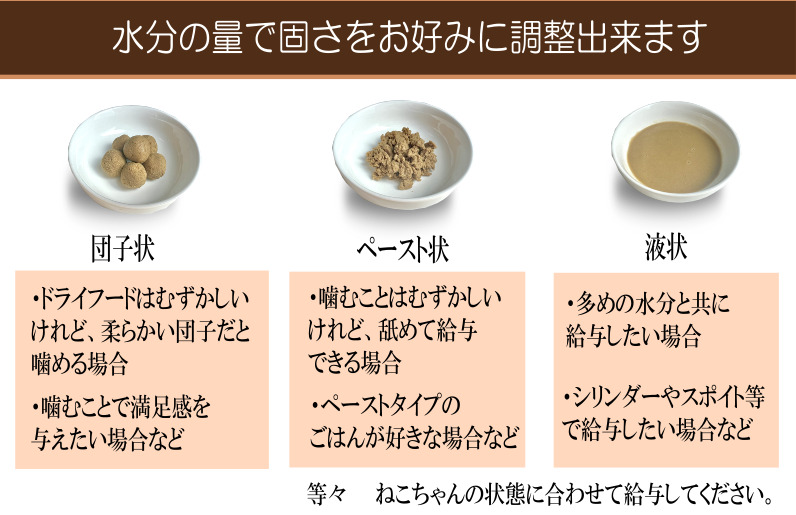 厳選したヒューマングレードの食材のみを使用したこだわりの国産無添加キャットフード「いのちのごはん」をパウダー状にしました。粒が苦手なねこちゃんや噛むことが難しくなったねこちゃんに水分で硬さを調整して与えることができます。
