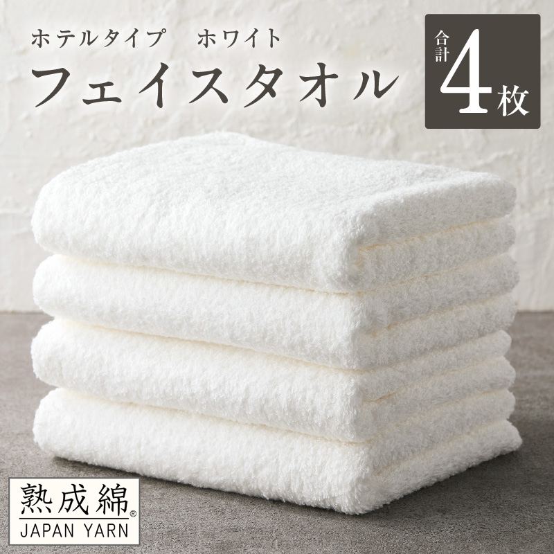 【ホテルタイプ】フェイスタオル4枚、カラー:ホワイト