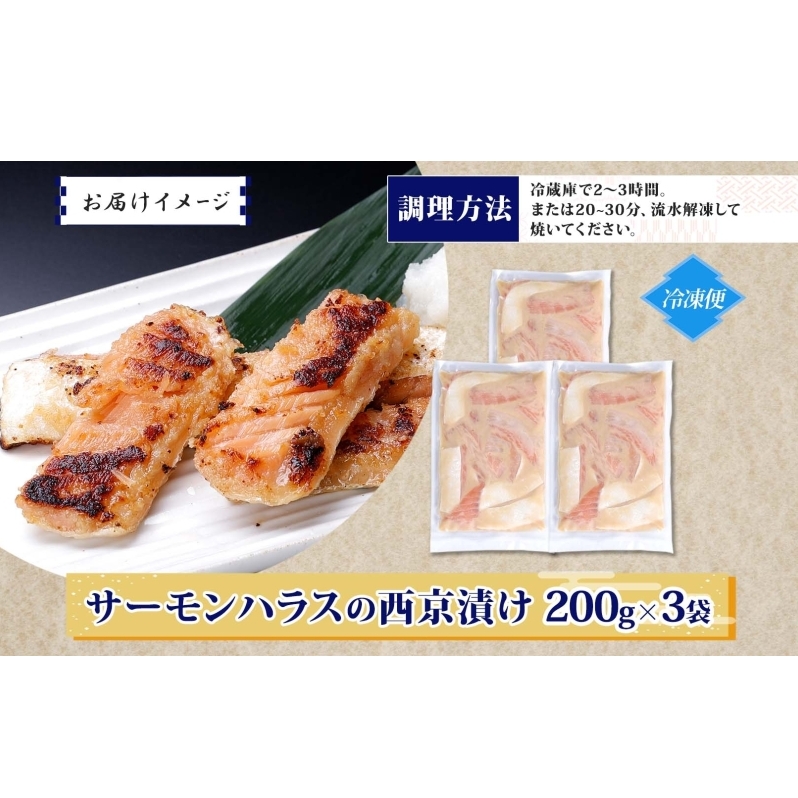 アトランティックサーモン ハラス 西京漬け 合計600g【小分け 200g×3P おかず お弁当 おつまみ 簡単調理 北国からの贈り物】 005A709