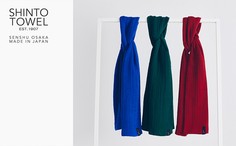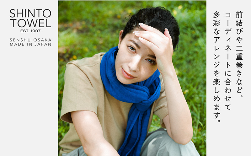 「外で使うタオル」の提案として、2.5重ガーゼの特長である優れた吸水性と速乾性、独自の風合いや肌触りといった機能を活かした「2.5重ガーゼ・タオルマフラー」です。