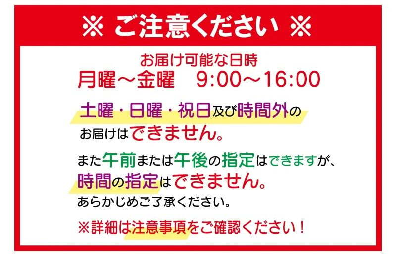 (1)お届け可能な日時は月曜~金曜の9:00~16:00です。土曜・日曜・祝日及び時間外のお届けはいたしかねます。また、午前または午後の指定は承れますが、時間の指定は承れませんのであらかじめご了承ください。